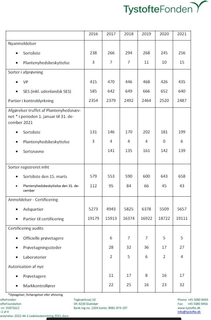 Under TystofteFonden/årsrapport kan du finde vores årsrapprt vedr 2021. Læg specielt mærke til oversigten på side 7, der beskriver omfanget af afprøvninger, uddannelser samt afgørelser truffet af Plantenyhedsnævnet