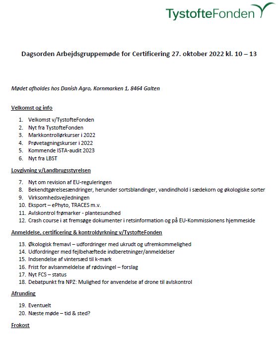 Torsdag d. 27. oktober 2022 afholder vi møde i arbejdsgruppen for certificering sammen med Landbrugsstyrelsen.